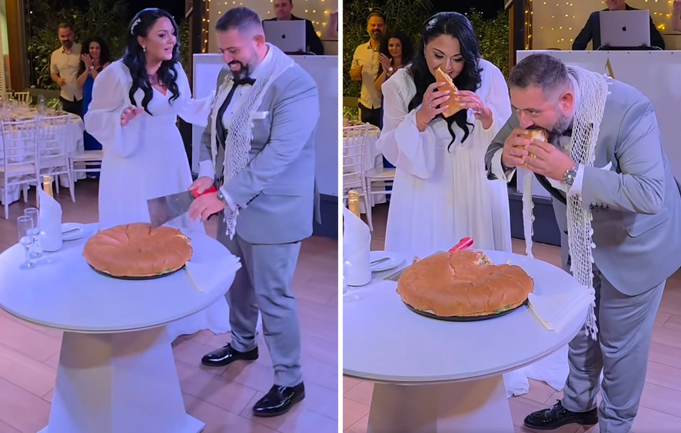 Ζευγάρι αποφάσισε να πρωτοτυπήσει και αντί για την καθιερωμένη κοπή γαμήλιας τούρτας, επέλεξε ένα κόψει  τεράστιο burger ως κεντρικό στοιχείο της δεξίωσης.