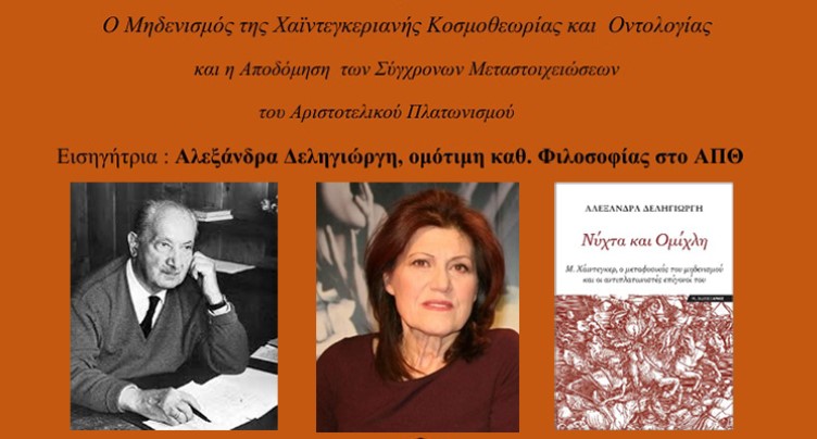 Θέμα της συζήτησης είναι: «Ο Μηδενισμός της Χαϊντεγκεριανής Κοσμοθεωρίας και Οντολογίας και η Αποδόμηση των Σύγχρονων Μεταστοιχειώσεων του Αριστοτελικού Πλατωνισμού», με εισηγήτρια την ομότιμη καθηγήτρια Φιλοσοφίας στο Αριστοτέλειο Πανεπιστήμιο Θεσσαλονίκης Αλεξάνδρα Δεληγιώργη.