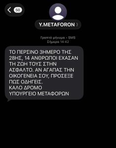 «Το περσινό 3ήμερο της 28ης Οκτωβρίου, 14 άνθρωποι έχασαν τη ζωή τους στην άσφαλτο. Αν αγαπάς την οικογένειά σου, προσοχή στο δρόμο».