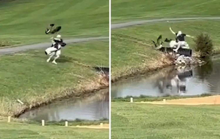 Στο βίντεο που φέρει στη δημοσιότητα η Daily Mail ο άνδρας, κρατώντας τον σάκο με τα μπαστούνια του, πέφτει προς τα πίσω μέσα σε μια μικρή λίμνη.