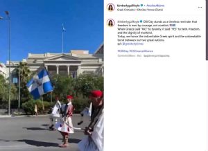 Έγραψε λοιπόν: «Η ημέρα του ΟΧΙ στέκει ως μια διαχρονική υπενθύμιση ότι η ελευθερία κερδίζεται με το θάρρος, όχι με την άνεση. Όταν η Ελλάδα είπε ΟΧΙ στη τυραννία, είπε ΝΑΙ στην πίστη, στην ελευθερία και την αξιοπρέπεια της ανθρωπότητας. Σήμερα, τιμούμε το αδάμαστο ελληνικό πνεύμα και τον άθραυστο δεσμό μεταξύ των δύο μεγάλων εθνών μας».