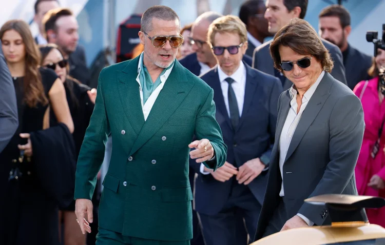 Ο πρωταγωνιστής του «F1» επέλεξε ένα πράσινο κοστούμι Anderson & Sheppard, λευκό πουκάμισο, μεταξωτό φουλάρι και γυαλιά ηλίου, ενώ ο σταρ του «Top Gun» φόρεσε ένα σκούρο γκρι κοστούμι, ανοιχτόχρωμο πουκάμισο και μαύρα παπούτσια.