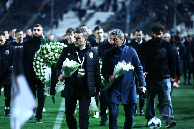 Λίγο αργότερα, διαιτητές και οι 22 ποδοσφαιριστές εμφανίστηκαν στον αγωνιστικό χώρο φορώντας μπλουζάκια με την επιγραφή «27/01/2026 – ΑΘΑΝΑΤΟΙ» και κατευθύνθηκαν όλοι προς τη Θύρα 4, αφήνοντας στεφάνια και λουλούδια.