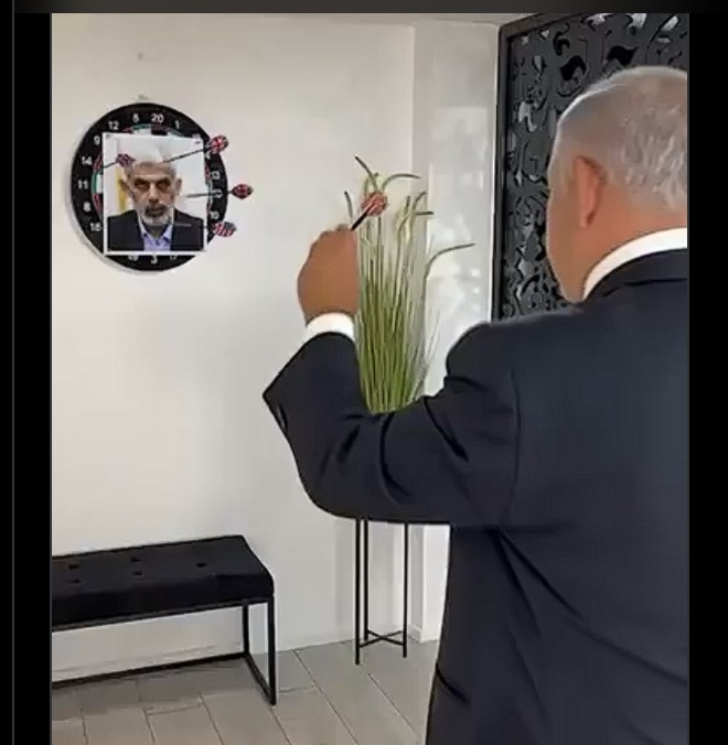 Ο ηγέτης της Χαμάς στη Γάζα βρίσκεται στο bullseye. Όχι τυχαία. Στο βίντεο, ο Νετανιάχου τον σημαδεύει πρώτον, σαν να θέλει να δείξει ότι η σύγκρουση στη Γάζα είναι η καρδιά της προσωπικής του ατζέντας.