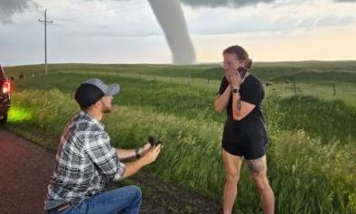 Ο Μπράις Σέλτον και η Πέιτζ Μπερντόμας, δύο «κυνηγοί καταιγίδων», βρίσκονταν στη Νότια Ντακότα όταν εκείνος γονάτισε για να της κάνει πρόταση γάμου. Πίσω τους, ένας εντυπωσιακός ανεμοστρόβιλος σχηματιζόταν στον ουρανό, δημιουργώντας ένα σκηνικό που θύμιζε κινηματογραφική σκηνή.