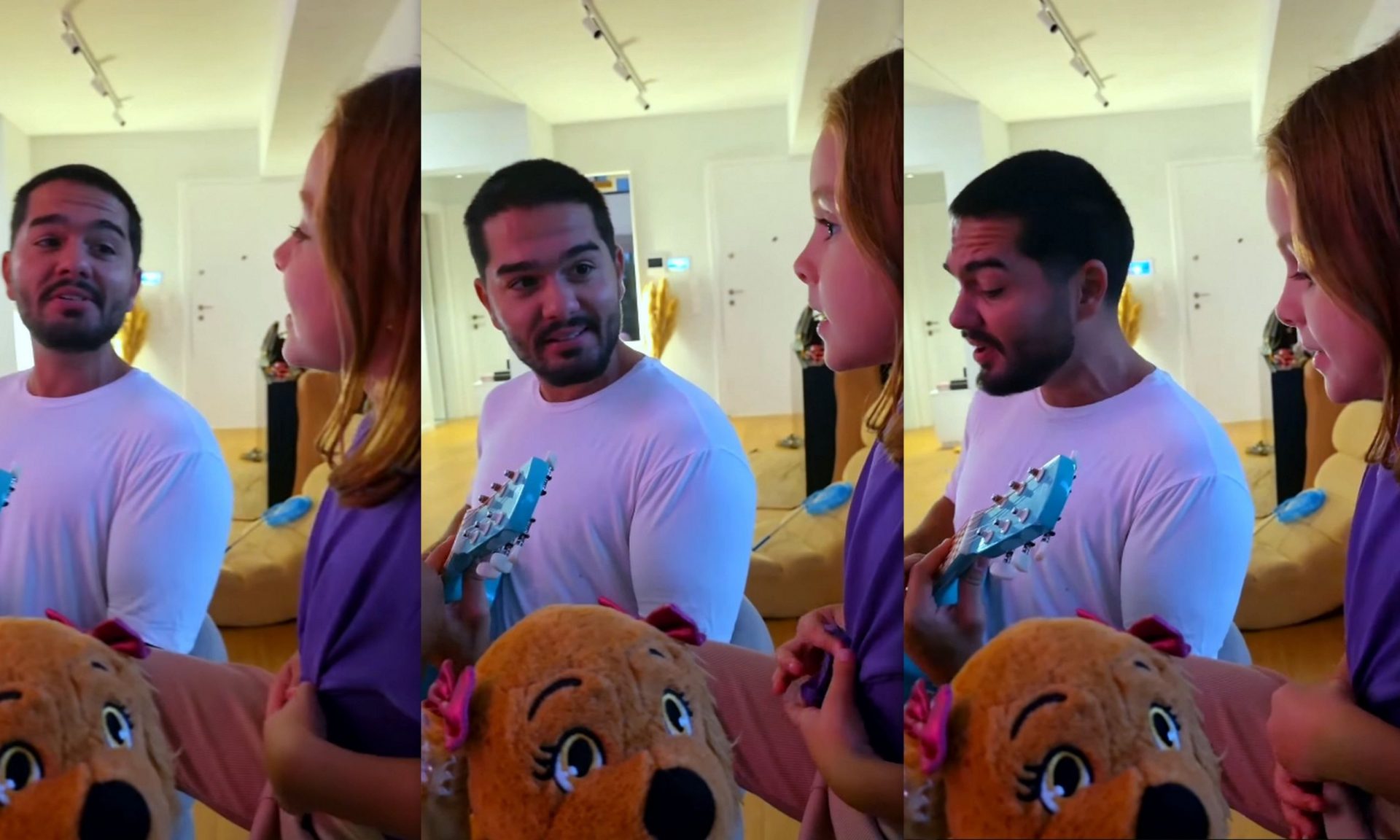 Στο βίντεο που ανήρτησε η Βασιλική Μιλλούση, ο Μάστορας «γρατζουνάει» την κιθάρα σαν κανονική, ενώ οι μικρές σιγοτραγουδούν.