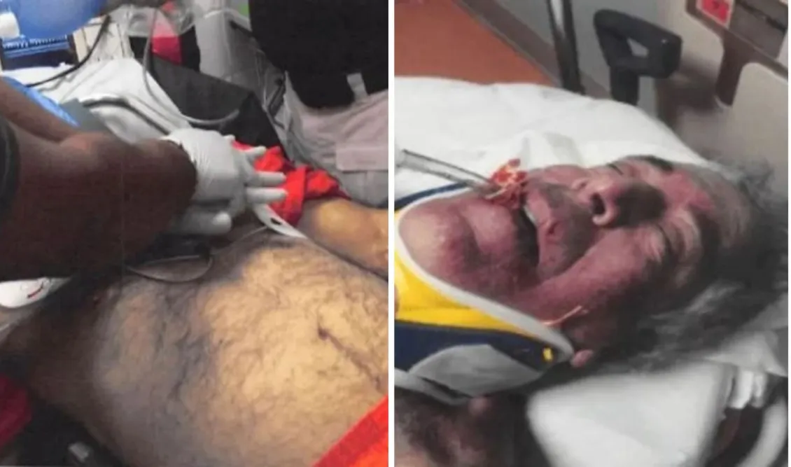 Σε μία από αυτές, ο χρηματιστής εμφανίζεται με σκισμένη την πορτοκαλί φόρμα της φυλακής και ηλεκτρόδια απινιδωτή στο στήθος, ενώ στο φορείο διακρίνονται φιάλες οξυγόνου και ιατρικοί σωλήνες.
