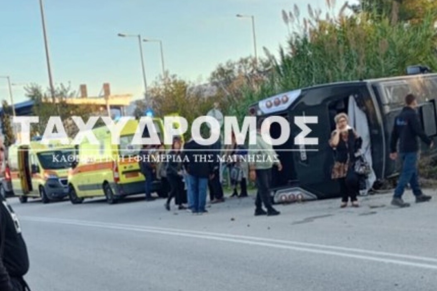 Ένα λεωφορείο με περίπου 40 επιβάτες εξετράπη από την πορεία του και ανατράπηκε το απόγευμα του Σαββάτου στην παλιά Εθνική Οδό πριν τον Ριζόμυλο του Βόλου, ένα χιλιόμετρο πριν το κέντρο διασκέδασης «Μέγαρο».