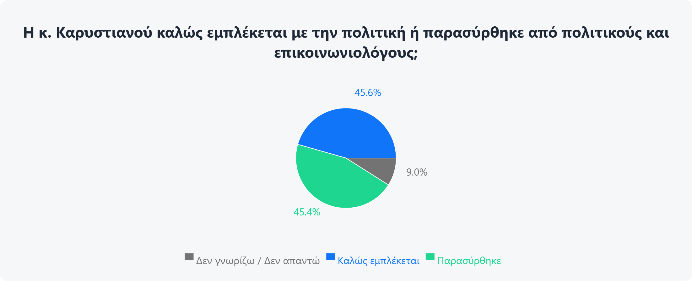Και εδώ τελειώνουν όλα μια και αφενός οι γνώμες είναι διχασμένες, με το εάν θα έπρεπε να κατέβει στην πολιτική ή εάν παρασύρθηκε (45,6% και 45,4% αντίστοιχα) και αφετέρου τόσο οι τελευταίες δηλώσεις της όσο και οι δηλώσεις πρώην συνεργατών της και γονέων θυμάτων των Τεμπών δημιουργούν δεύτερες σκέψεις σχετικά με το κατά πόσο θα μπορούσε να είναι το «νέο» άφθαρτο πολιτικό πρόσωπο του 2027…