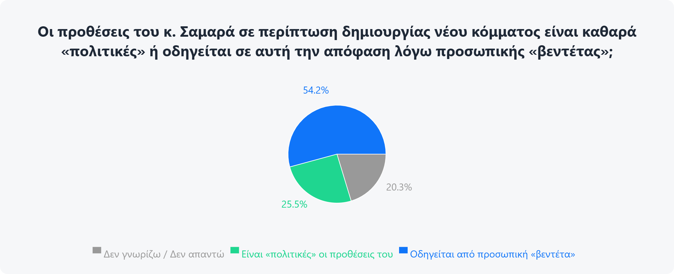 Σε ό,τι αφορά τον λόγο για τον οποίο θα έκανε δικό του κόμμα ο Αντώνης Σαμαράς, οι ερωτηθέντες φαίνονται ελαφρώς διχασμένοι, με την πλειοψηφία να θεωρεί για λόγους προσωπικής βεντέτας, 20,3% να μην είναι απόλυτα σίγουρο για την απάντησή του, ενώ το 25,5% να λέει ότι οι προθέσεις του είναι καθαρά πολιτικές.