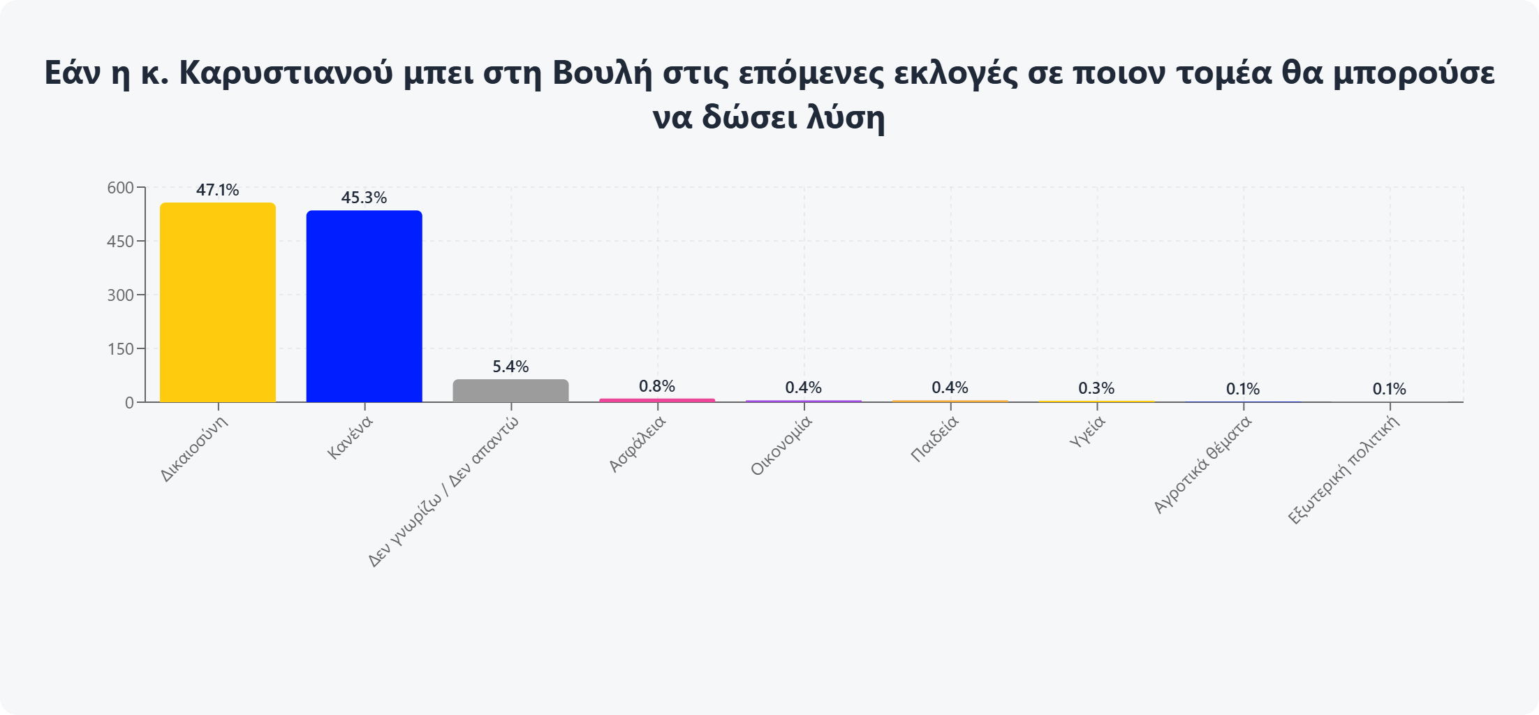Είναι αναμφισβήτητα το πρόσωπο του 2025, όμως το ερώτημα είναι αν θα τα καταφέρει να παραμείνει έως τις εκλογές ή όχι… Ταυτισμένη απόλυτα με την τραγωδία των Τεμπών και με τους αγώνες της για δικαιοσύνη και δικαίωση, η Μαρία Καρυστιανού «εξαργυρώνει» (όχι με την κακή έννοια) την δημοφιλία της και για τον λόγο αυτό περισσότεροι από 5 στους 10 ερωτηθέντες (53,9%) θεωρούν ότι θα πρέπει να «μπει» στην επόμενη Βουλή, ενώ το 47,1% πιστεύει ότι (εάν συμβεί αυτό) θα μπορέσει να δώσει λύση στο πεδίο της δικαιοσύνης.
