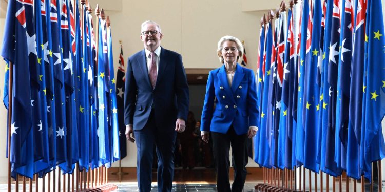 Μετά από δέκα ολόκληρα χρόνια διαπραγματεύσεων, η Ευρωπαϊκή Ένωση και η Αυστραλία κατέληξαν σε μια σημαντική εμπορική συμφωνία, η οποία αναμένεται να αλλάξει το τοπίο στις μεταξύ τους οικονομικές σχέσεις. Τη συμφωνία επισφράγισαν η πρόεδρος της Κομισιόν Ούρσουλα φον ντερ Λάιεν και ο πρωθυπουργός της Αυστραλίας Άντονι Αλμπανέζε, δίνοντας το στίγμα μιας νέας εποχής στο διμερές εμπόριο.