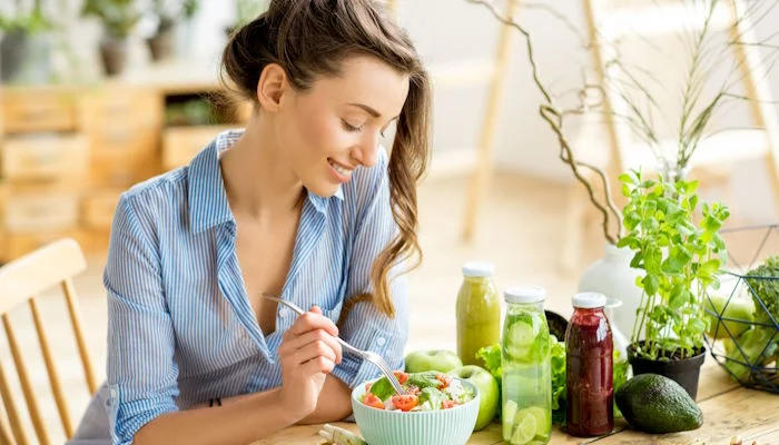 - Φρούτα και λαχανικά: προσφέρουν φυτικές ίνες και βιταμίνες, που βοηθούν να νιώσεις ανάλαφρη.