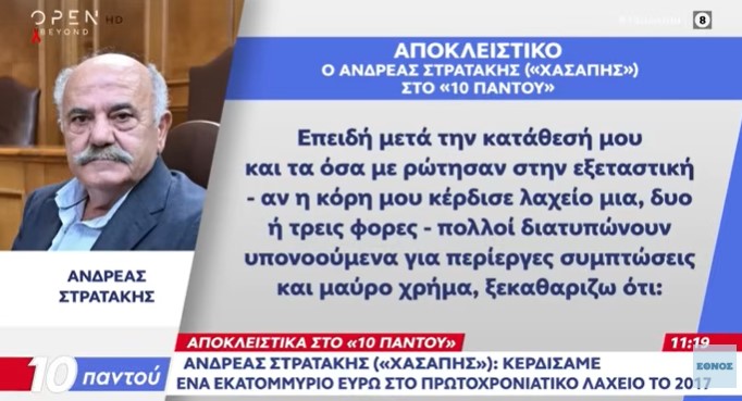 Από τη μεριά του ο Ανδρέας Στρατάκης (Χασάπης) ανέφερε «επειδή μετά την κατάθεσή μου στην Εξεταστική, όπου με ρώτησαν αν η κόρη μου κέρδισε λαχείο, διατυπώνονται υπόνοιες για περίεργες συμπτώσεις και μαύρο χρήμα ξεκαθαρίζω ότι πρόσωπο της οικογένειάς μου κέρδισε το Πρωτοχρονιάτικο Λαχείο το 2017, ήταν περίπου 1.000.000 ευρώ.