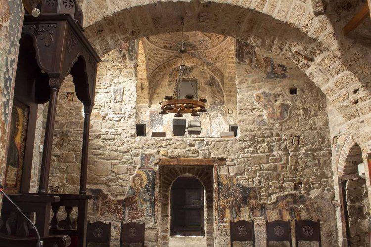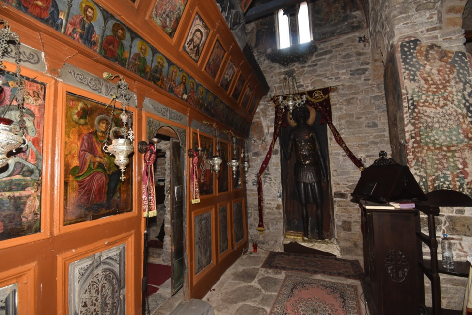 Οι τοιχογραφίες του σχετίζονται με τη δυναστεία των Παλαιολόγων, και ξεχωριστή θέση κατέχει η ανάγλυφη εικόνα του Αγίου Γεωργίου.