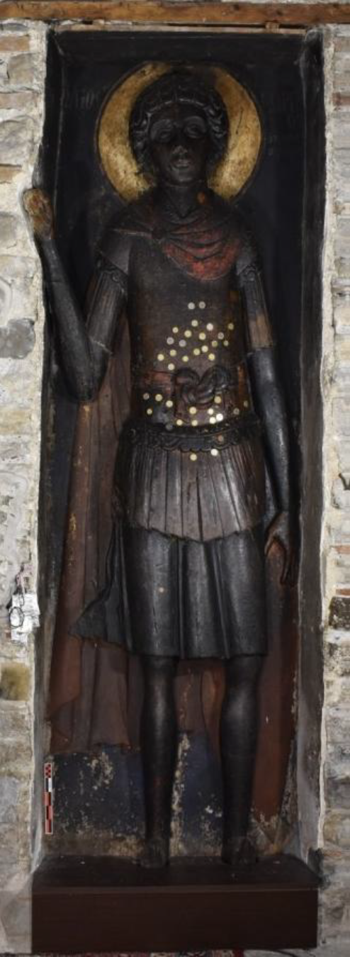 Το Υπουργείο Πολιτισμού -δια της Εφορείας Αρχαιοτήτων Καστοριάς- προβαίνει στη συντήρηση της ξύλινης ανάγλυφης εικόνας του Αγίου Γεωργίου, μοναδικό δείγμα μνημειακής ξυλογλυπτικής βυζαντινής τέχνης, ύψους περίπου τριών μέτρων η οποία χρονολογείται, πιθανότατα, στον 13ο αι.